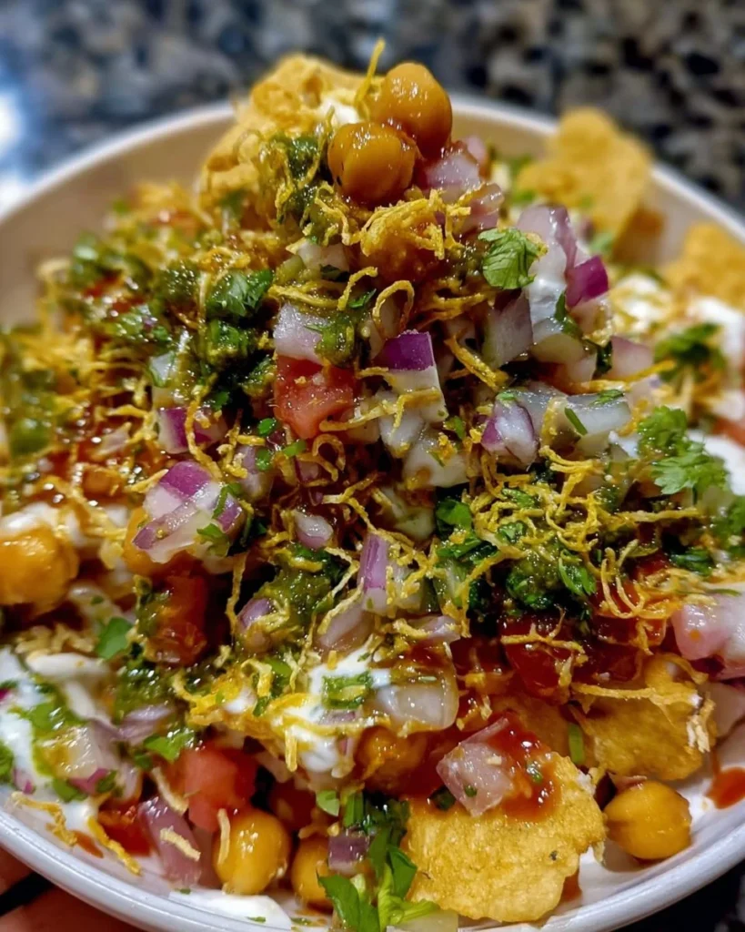 Delicious spicy potato noodles topped with fresh herbs and spices