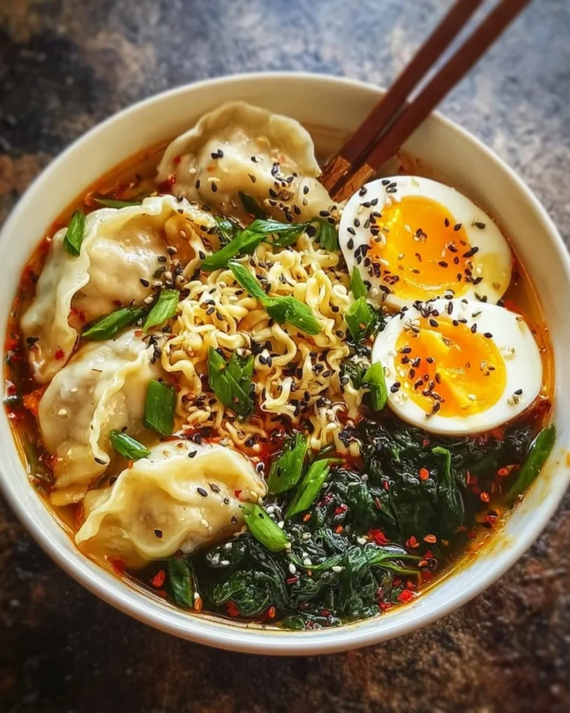 This Dumpling Ramen Bowl blends savory broth, crispy dumplings, tender noodles, and a soft-boiled egg for a comforting meal.Ingredients for Dumpling Ramen Bowl