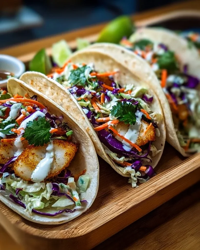 These fish tacos combine fresh, flaky fish with zesty slaw and creamy sauce for a light yet satisfying meal.Ingredients: