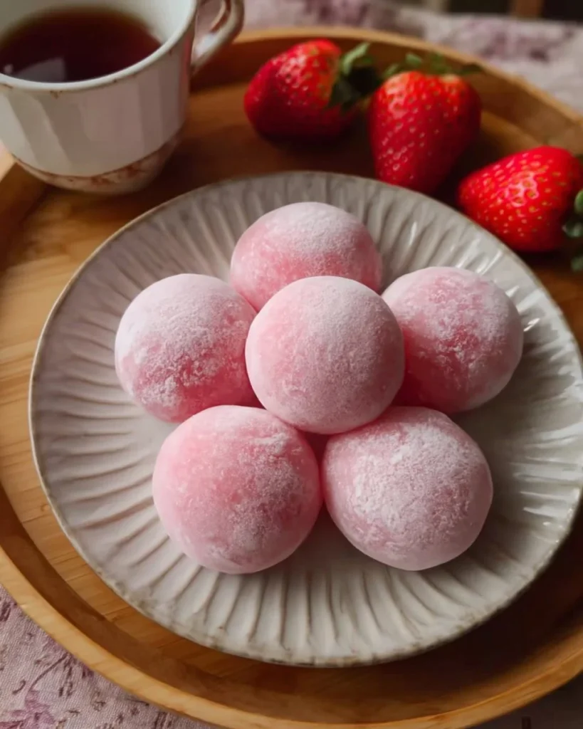 Strawberry mochi is a soft, chewy treat filled with fresh strawberries, wrapped in a delicate rice flour dough, offering a symphony of textures and flavors.
