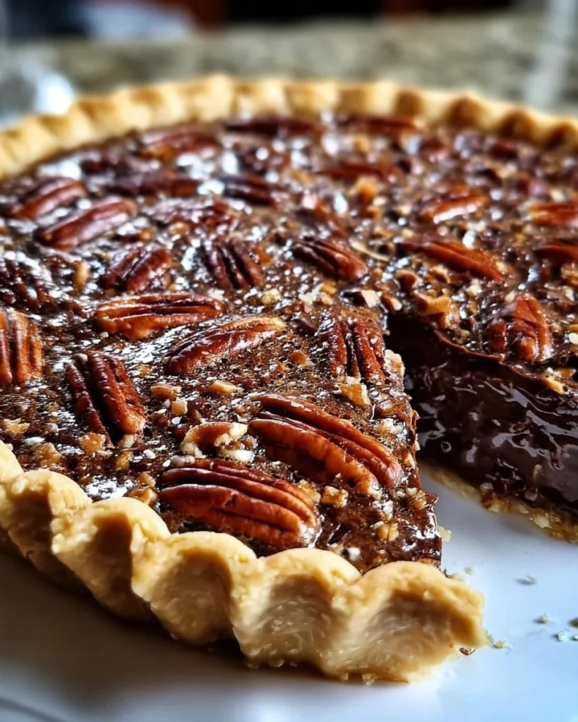 This Texas Chocolate Pecan Pie is a perfect fusion of rich chocolate and crunchy pecans in a flaky crust, making it a delightful ending to any meal.